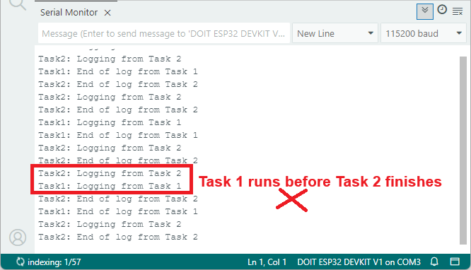 Notice that this time, the second task only starts after the first one finishes printing its output. The mutex prevents the tasks from overlapping. Both tasks want to access the Serial Monitor, but only the task holding the mutex can write to it.