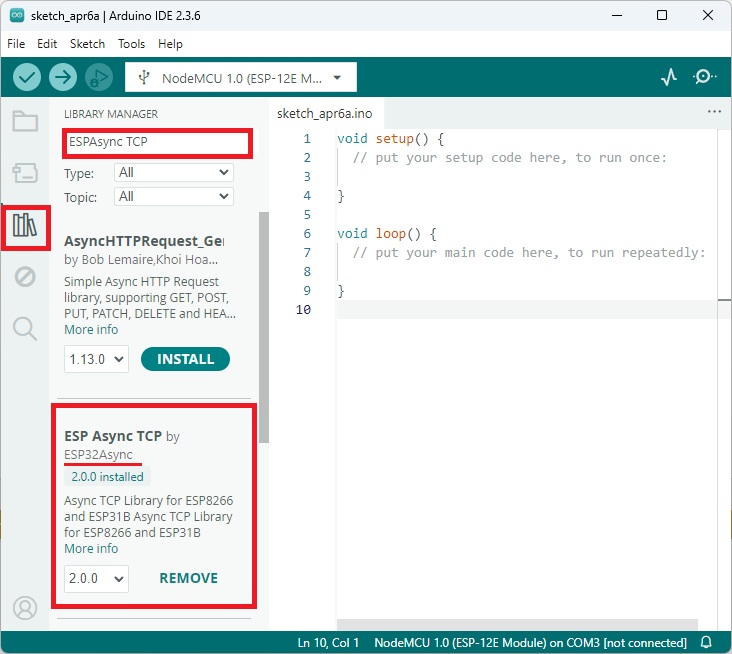 - Search for ESPAsyncTCP and install the ESPAsyncTCP library by ESP32Async. You may need to scroll down until you find the library by ESP32Async.